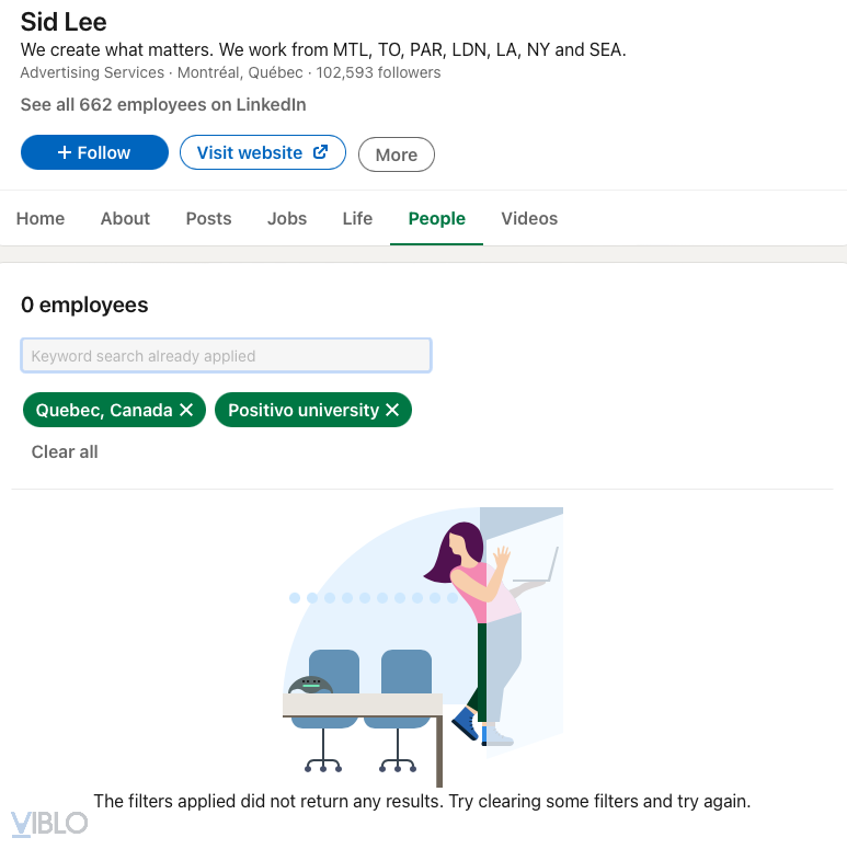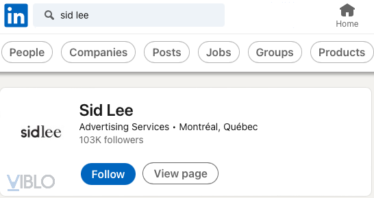 Với những thông tin về nơi ở, nơi làm việc, trường từng học và nơi làm việc thì tìm kiếm trên Linkedin là bước đầu tiên mình thực hiện. Linkedin là một mạng xã hội về việc làm rất lớn. Thậm chí, đối với lĩnh vực công nghệ thông tin thì Linkedin còn được trêu là "Tinder ngược". Đầu tiên, chúng ta sẽ tìm thông tin về công ty Sid Lee.