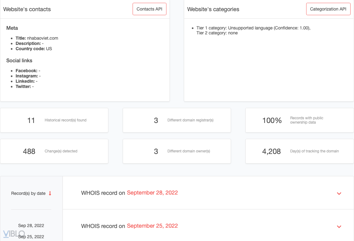 Chúng ta sẽ chọn mục Build Historic WHOIS report để xem thông tin đăng ký tên miền trong lịch sử. Chờ một chút thôi là các thông tin đã được thống kê và liệt kê đầy đủ theo thời gian gần nhất tới xa nhất.