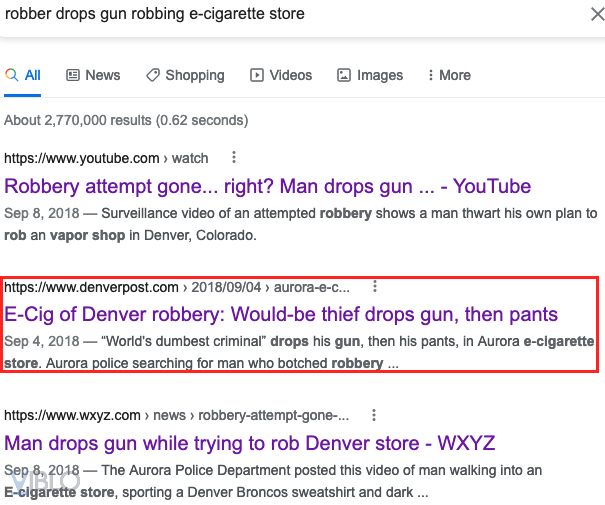 - Mục tiêu: tìm ra trang web của cửa hàng từng xảy ra vụ cướp hài hước mà kẻ cướp đã làm rơi súng của mình.