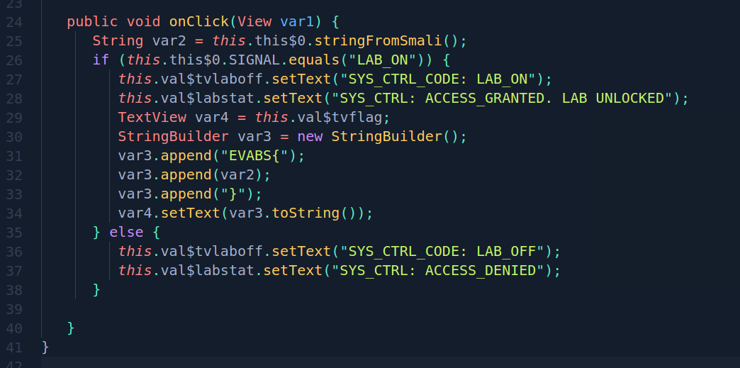 Dễ thấy nếu biến SIGNAL = "LAB_ON" thì chương trình sẽ in ra flag. Nhưng biến SIGNAL đang được đặt mặc định là "LAB_OFF" và không có lệnh nào thay đổi giá trị của biến này cả.