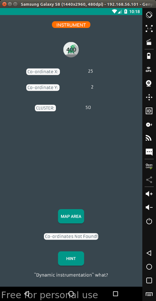 Khi click "MAP AREA" thì sẽ xuất hiện 2 tọa độ x và y cùng với 1 giá trị bằng x * y. Bài này cũng cần sử dụng Frida để làm, theo cảm nhận của mình thì còn dễ hơn level 11. Source code của level 12 trong file frida1.class