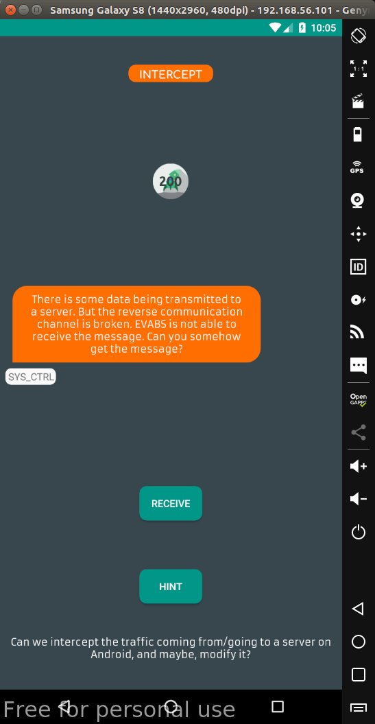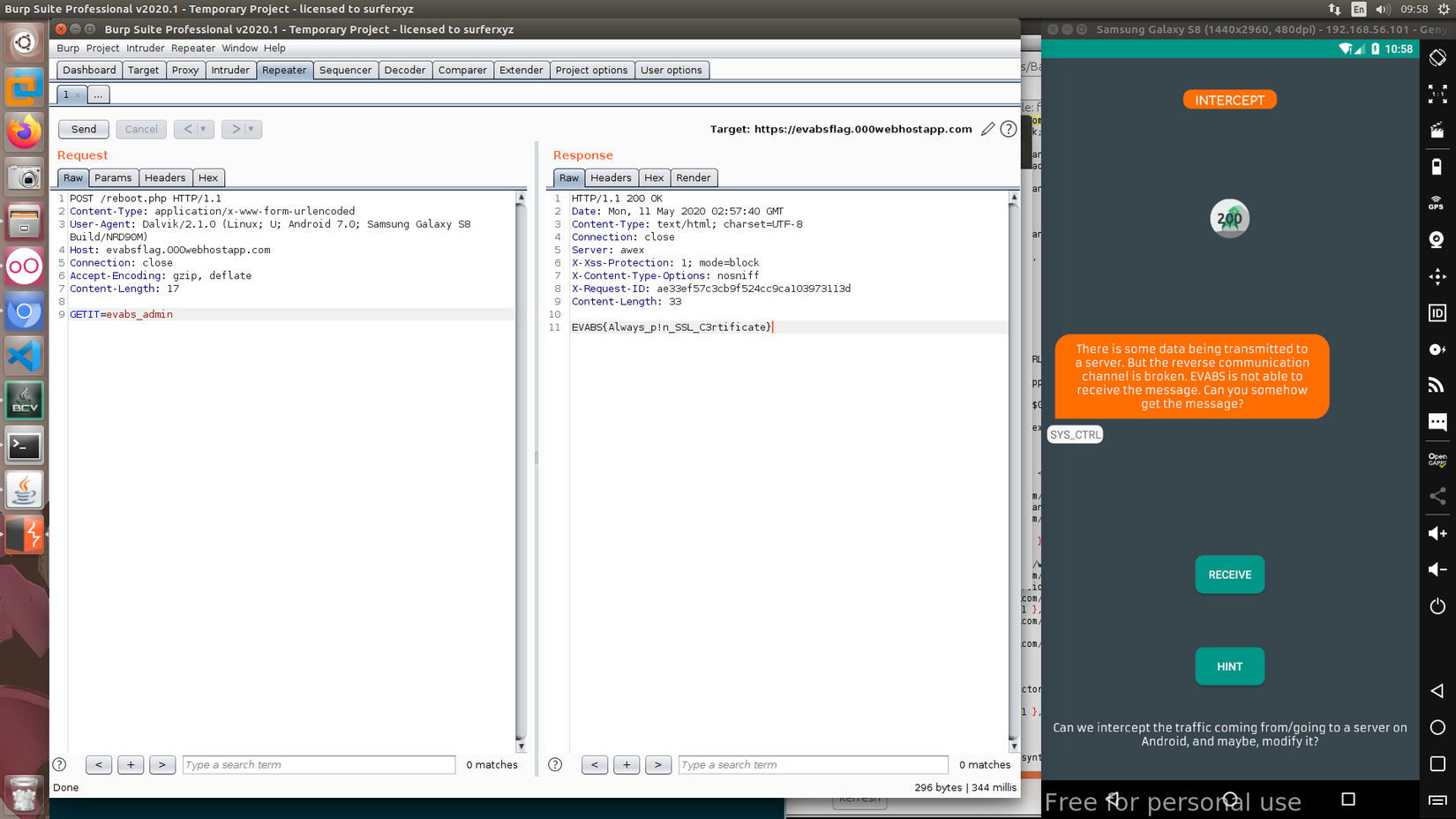 Theo như hint thì cần phải intercept request bằng burpsuite. Để intercept được request trên các phiên bản Android từ Android N trở lên thì phải add root CA có thời hạn ngắn. Nếu muốn đơn giản hơn thì chỉ cần cài EVABSv4 lên thiết bị có phiên bản thấp hơn Android N là sử dụng được burp CA.