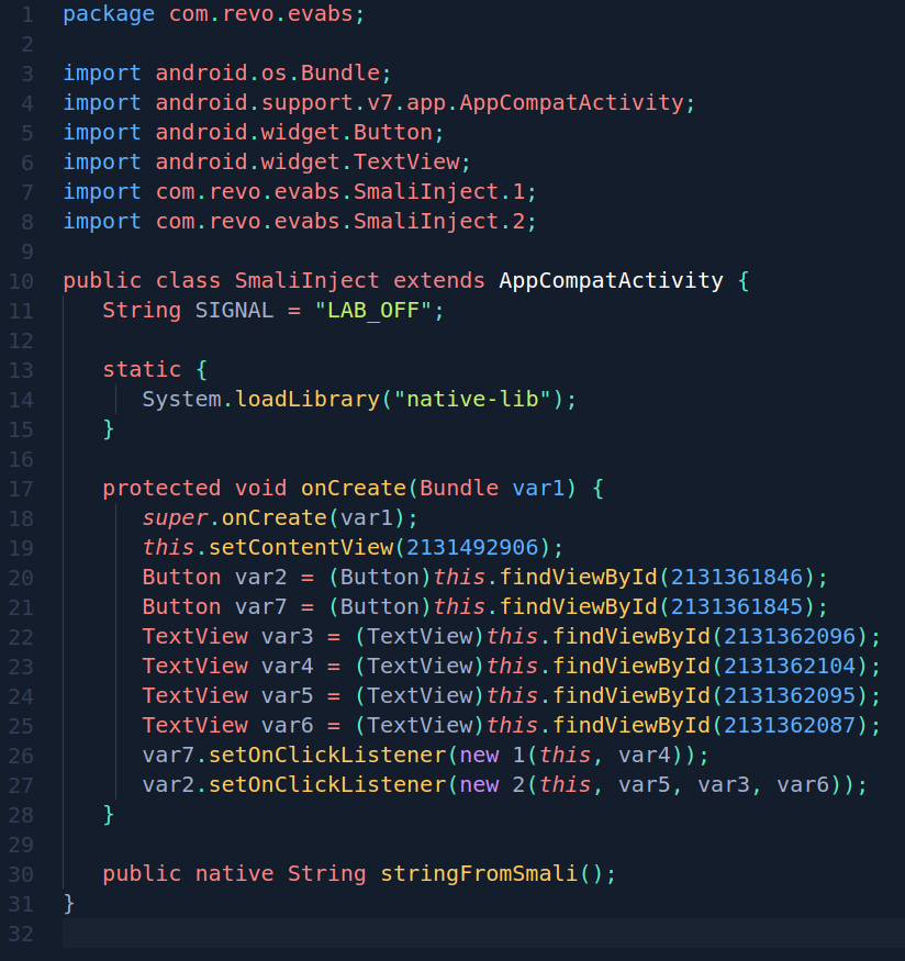 Vì thế chúng ta cần sửa code smali và build lại app mới sau khi sửa thì chương mình sẽ in ra flag. Cách patch và build lại file apk mình đã đề cập đến trong bài viết về [dịch ngược và patch file apk] (https://viblo.asia/p/tim-hieu-dang-ctf-reverse-android-dich-nguoc-va-patch-file-apk-Eb85okv252G)