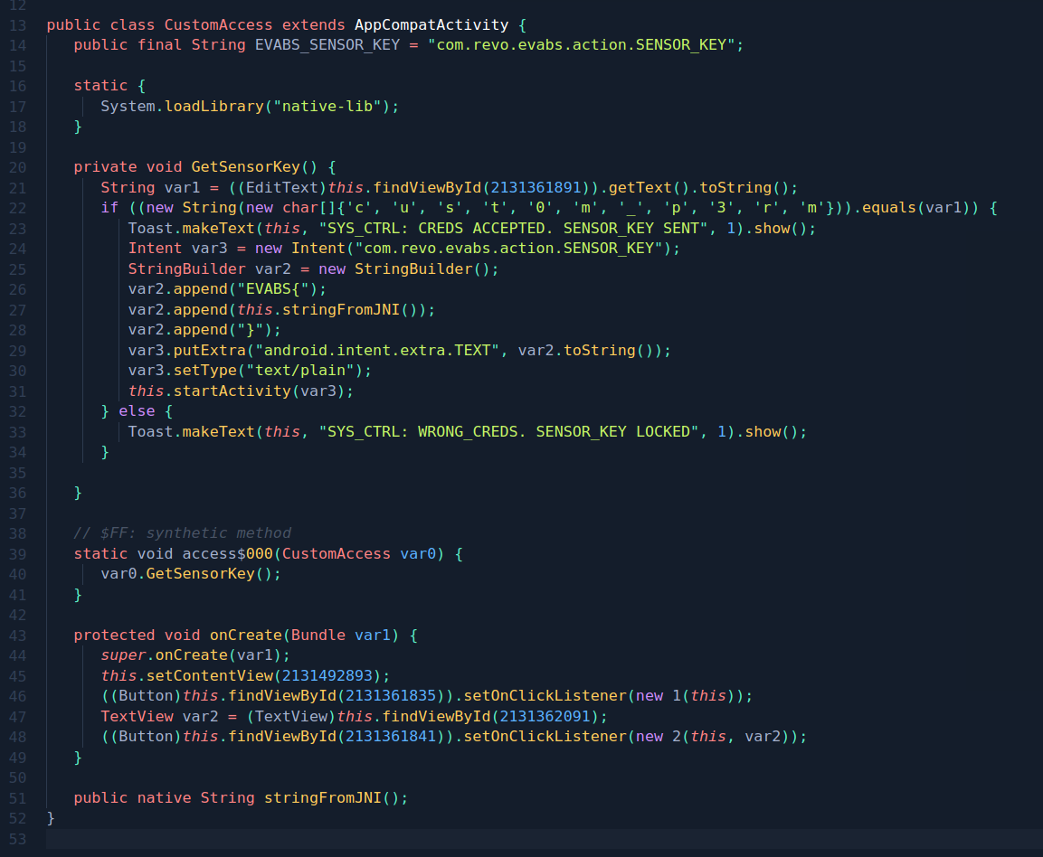 Sau khi nhập đúng input thì flag sẽ được truyền vào intent com.revo.evabs.action.SENSOR_KEY bằng hàm putExtra().