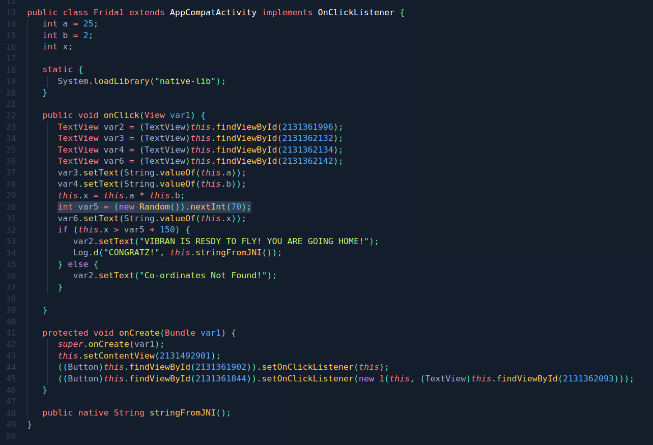 Logic so sánh của bài này rất đơn giản, flag sẽ được in ra nếu (x = a * b) > var5 + 150 với var5 là 1 số int random trong khoảng 0 -> 70. Vì a b cố định khiến x luôn là 50, như thế thì var5 random kiểu gì thì x cũng không thỏa mãn được. Vậy thì chỉ cần hook và sửa lại hàm nextInt(int) cho return -150 là được, nhanh gọn chẳng phải nghĩ hay tính toán gì.