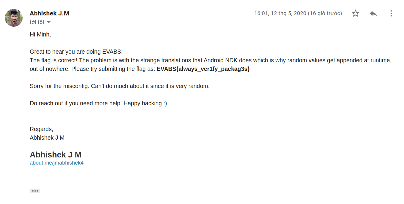 Ở đây khi mình kiểm tra flag thì lại báo là sai flag, trong khi mình khá chắc là cách mình làm đúng. Vì thế mình đã gửi mail hỏi tác giả của EVABS và nhận được phản hồi rằng cách mình làm là chính xác. Do code random có lỗi nên flag sinh sai.