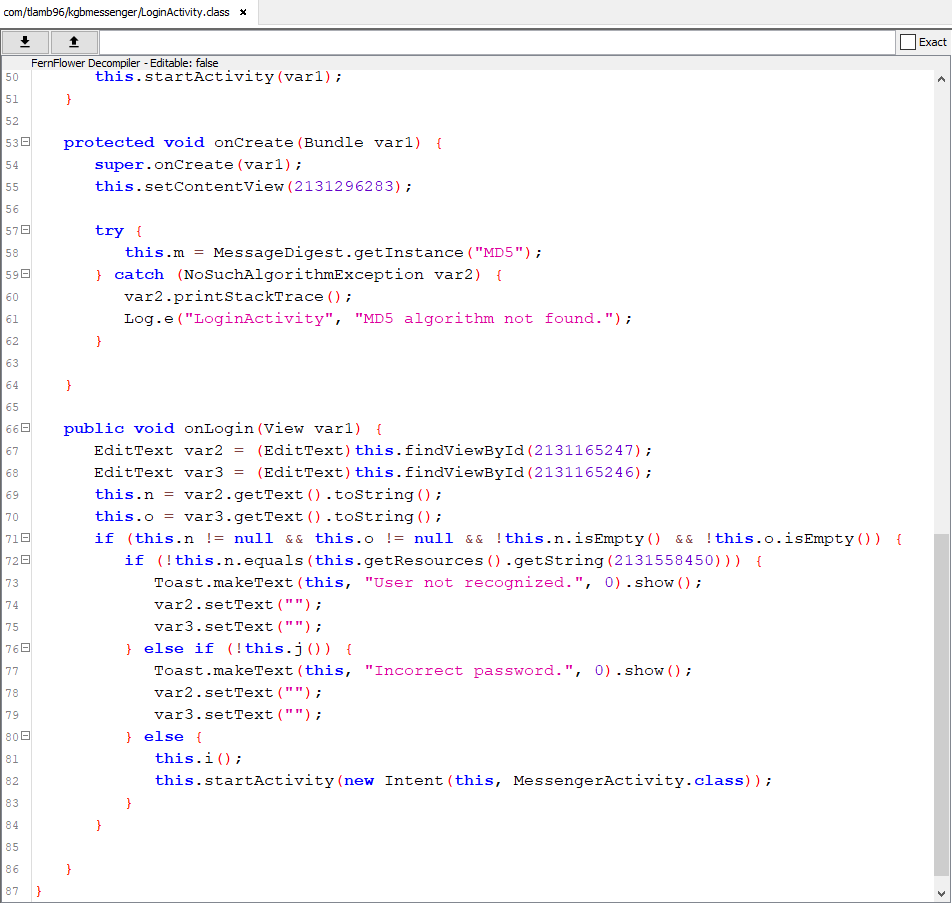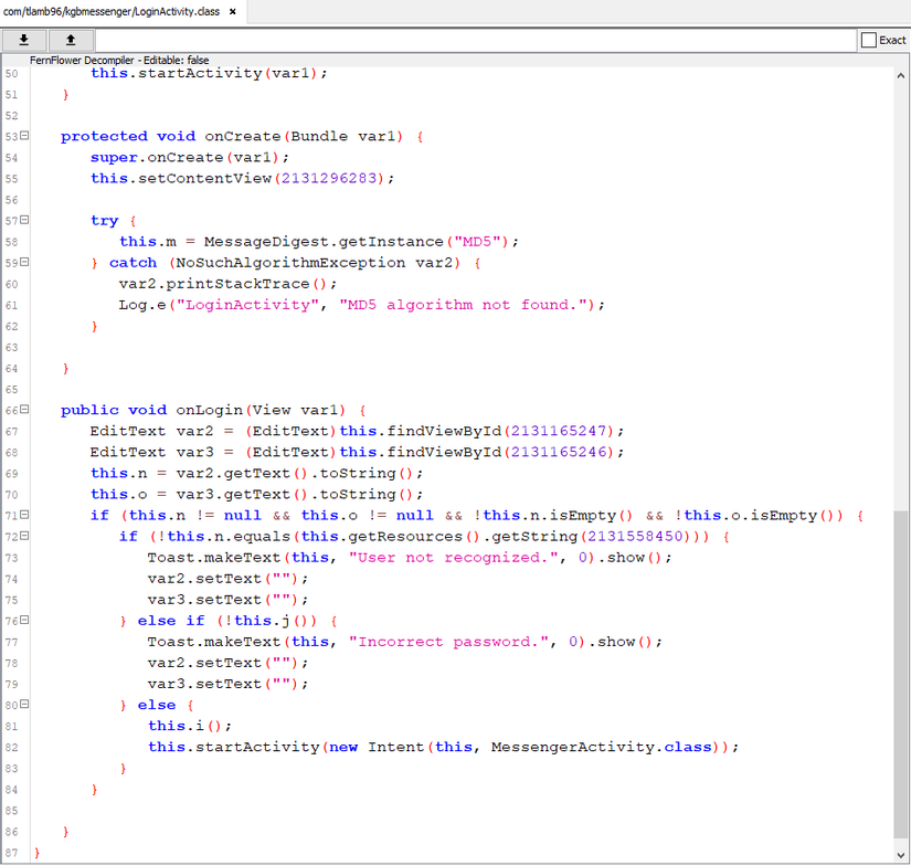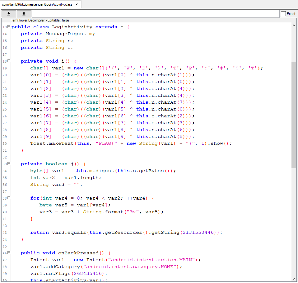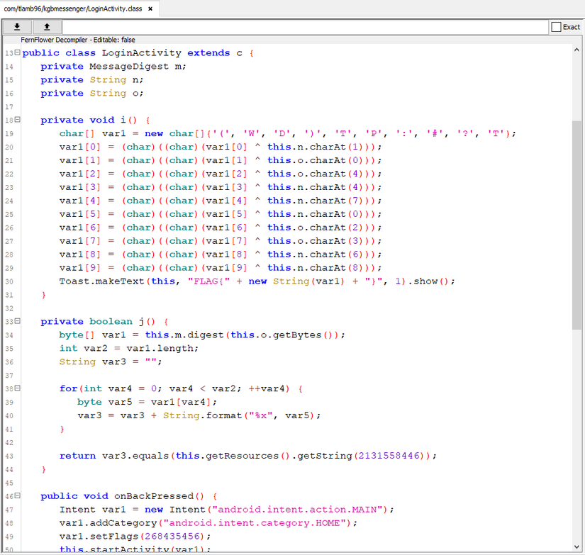 Chúng ta lấy được cả 1 value password = 84e343a0486ff05530df6c705c8bb4 luôn nhưng không login đc, app báo wrong password và cũng không tìm được giá trị trước khi hash. Kiểm tra kỹ hơn class LoginActivity, cụ thể là hàm j() chúng ta biết rằng đoạn string đó là giá trị password sau khi hash MD5, nhưng đã bị xóa đi 2 ký tự (vì MD5 có 32 ký tự mà string password này chỉ có 30 ký tự).