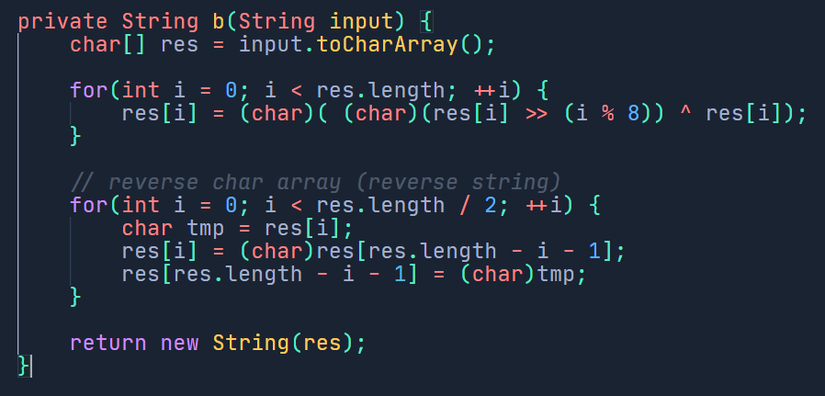 Việc xử lý của hàm b() rất đơn giản thôi. Mỗi ký tự sẽ được dịch phải 0 ~ 7 bit tùy theo index của nó trong mảng, sau đó xor với nội dung ban đầu của chính nó. Cuối cùng đảo ngược thứ tự mảng và ghép lại thành 1 string.