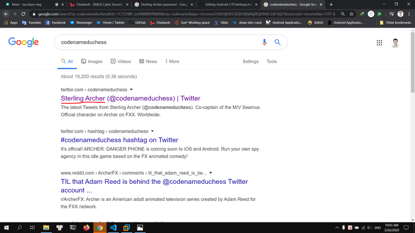 Làm đến đây thì mình phải xem writeup của người khác. Hóa ra đúng như trong repo gốc đã nói trước thì flag này cần kỹ năng recon. Search từ khóa "codenameduchess" thì kết quả đầu tiên là trang twitter Sterling Archer, trùng với string value của resource user.