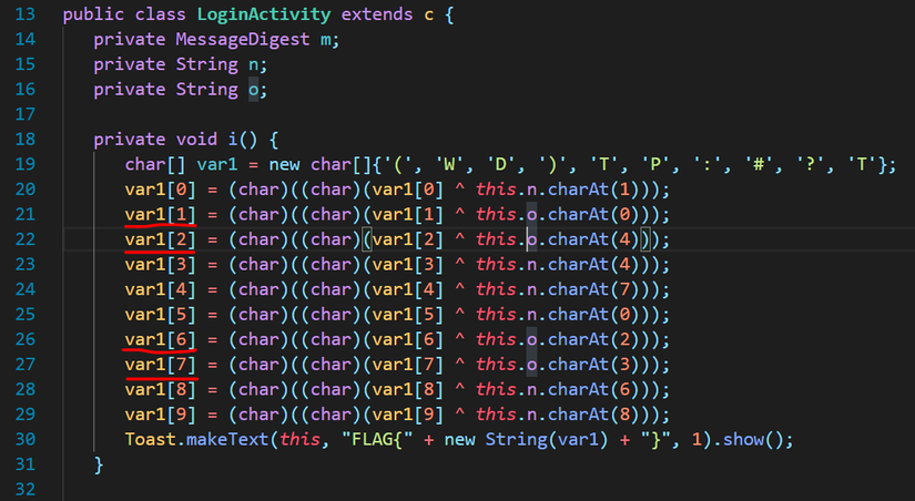 Hàm i() là hàm decode từ username và password đúng ra flag, chỉ dùng phép xor thôi. Nội dung flag có 10 ký tự, trong đó có 4 ký tự được xor với password đúng nên có thể thử guessing được: FLAG{G??G13??R0}