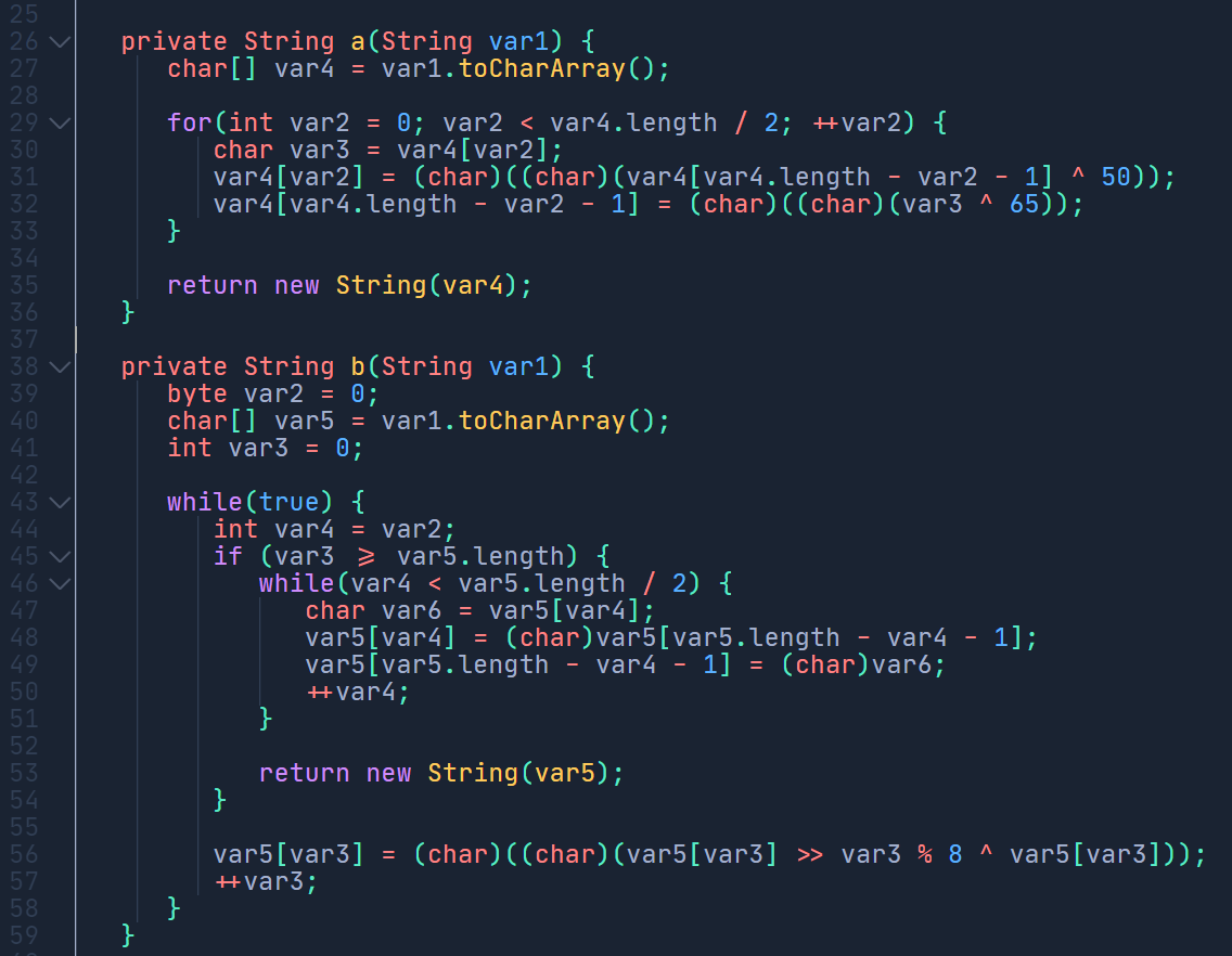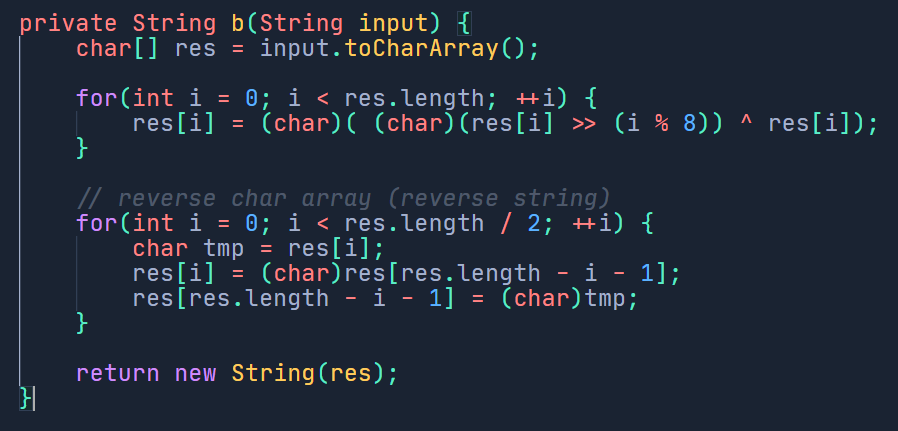 Nhìn vào hàm onSendMessage() chúng ta thấy rằng nếu input nhập vào sau khi được xử lý bởi hàm b() trùng với string r thì flag sẽ xuất hiện. Vậy thì tìm hiểu xem hàm b() xử lý input như nào thôi. Trước khi phân tích kỹ hàm b() thì mình sẽ cố gắng viết lại thân hàm để dễ nhìn hơn, decompiler này chuyển sang while làm mọi thứ trông hơi rối, trong khi hoàn toàn có thể chuyển thành vòng lặp for tường minh hơn.