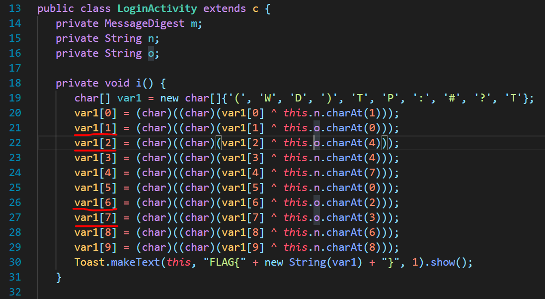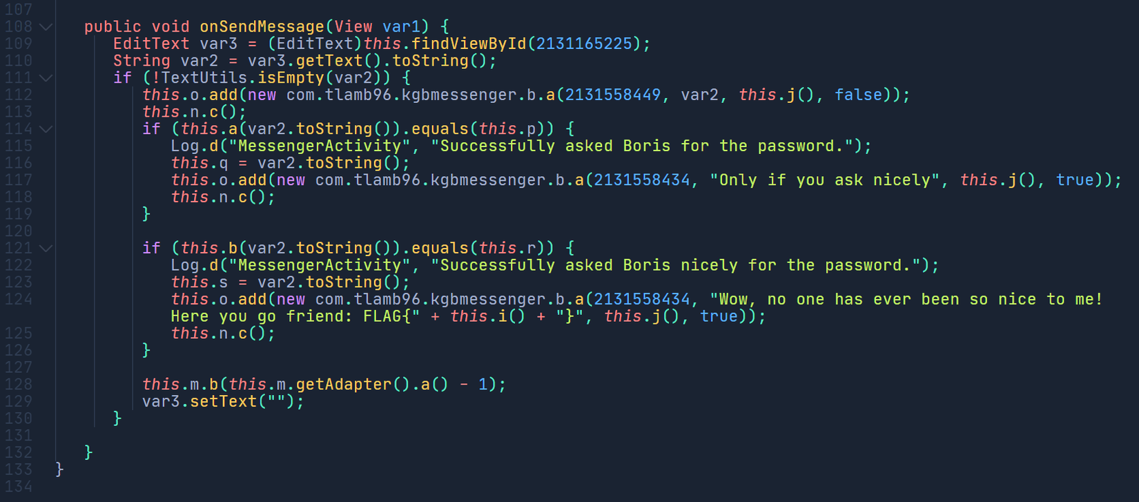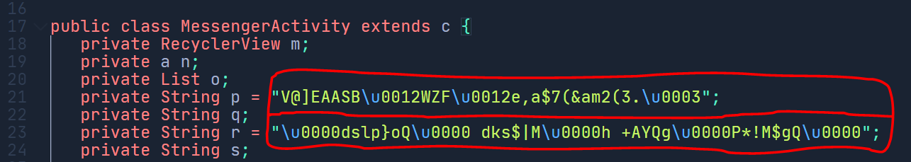 Ồ, có vẻ như không hiệu quả. Mình đã thử thay đổi dấu câu ở cuối nhưng cũng không thấy flag đâu. Có thể do mình đã bỏ sót điều gì đó, vì thế mình kiểm tra kỹ hơn code của MessageActivity và nhận ra: hàm i() sẽ decrypt nội dung flag, nhưng hàm i() sẽ chỉ hoạt động khi 2 string q và s không rỗng. String s sẽ được set giá trị trong if 2 ( if (this.b(var2.toString()).equals(this.r)) ), còn String q sẽ được set giá trị trong if 1 ( if (this.a(var2.toString()).equals(this.p)) ) - mình đã bỏ qua phần này khi thấy if 2 sẽ in ra flag :v