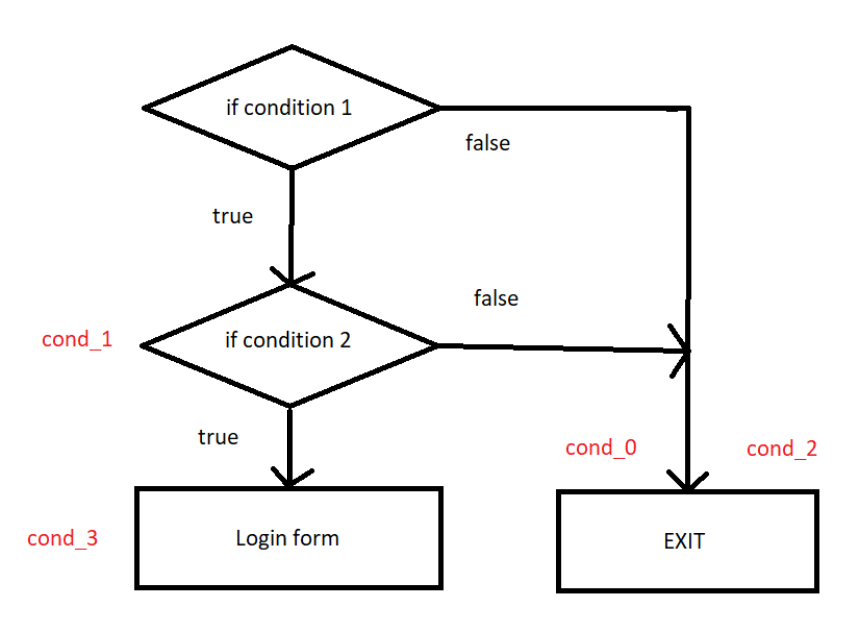 Bây giờ thì decompile và xem code smali. Vì sử dụng 2 cấu trúc if - else nên trong code smali có 4 nhánh kết quả: cond_0, cond_1, cond_2 và con_3. Đối chiếu với code java đã reverse, chúng ta có sơ đồ sau: