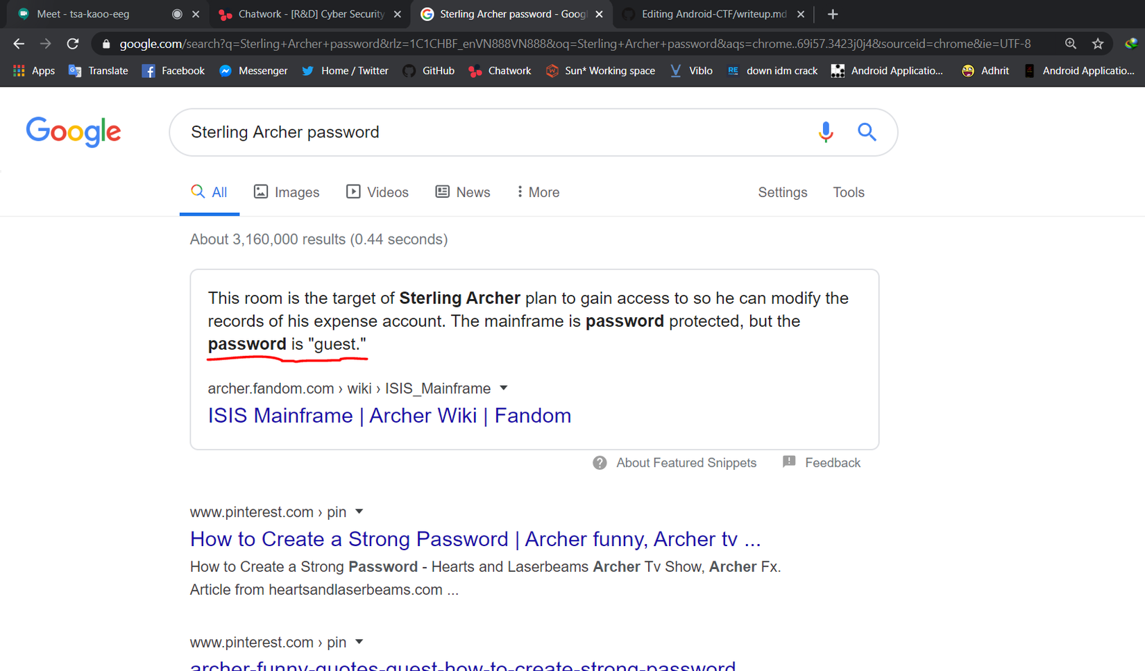 Sau đó mình search từ khóa "Sterling Archer password" thì tìm được password là guest.