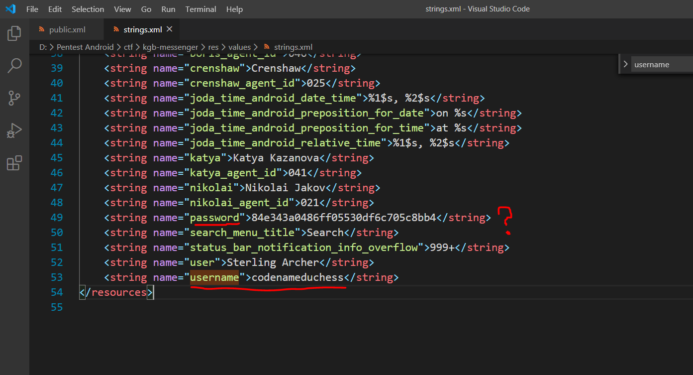 Đọc code đã reverse thì chúng ta xác định được luôn 2 string n và o lần lượt là username và password nhập vào. Tại hàm onLogin() - xử lý các logic đăng nhập có truy cập 1 resourse id như các bài trước đó, làm tương tự chúng ta tìm đc username = codenameduchess.