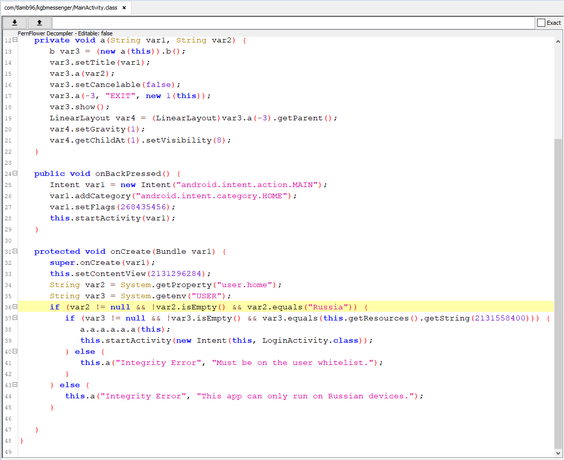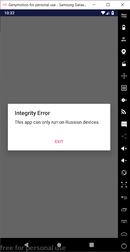 Đây là chướng ngại đầu tiên chúng ta phải vượt qua nếu muốn tiếp cận các thông tin bí mật của tổ chức tình báo Nga. Ngay khi vừa bật app lên chúng ta đã nhận được không báo rằng chỉ thiết bị của Nga mới có thể sử dụng được app.