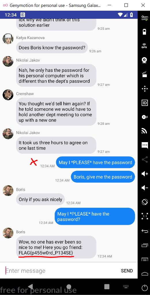 Giờ thì mình sẽ nhập Boris, give me the password, sau đó nhập tiếp May I *PLEASE* have the password?. Nếu không được thì có thể phần dấu câu ở cuối bị sai, hoặc vẫn còn gì đó bị bỏ sót,... Nhưng thật may là mọi thứ hoạt động tốt, và chúng ta đã có flag cuối.