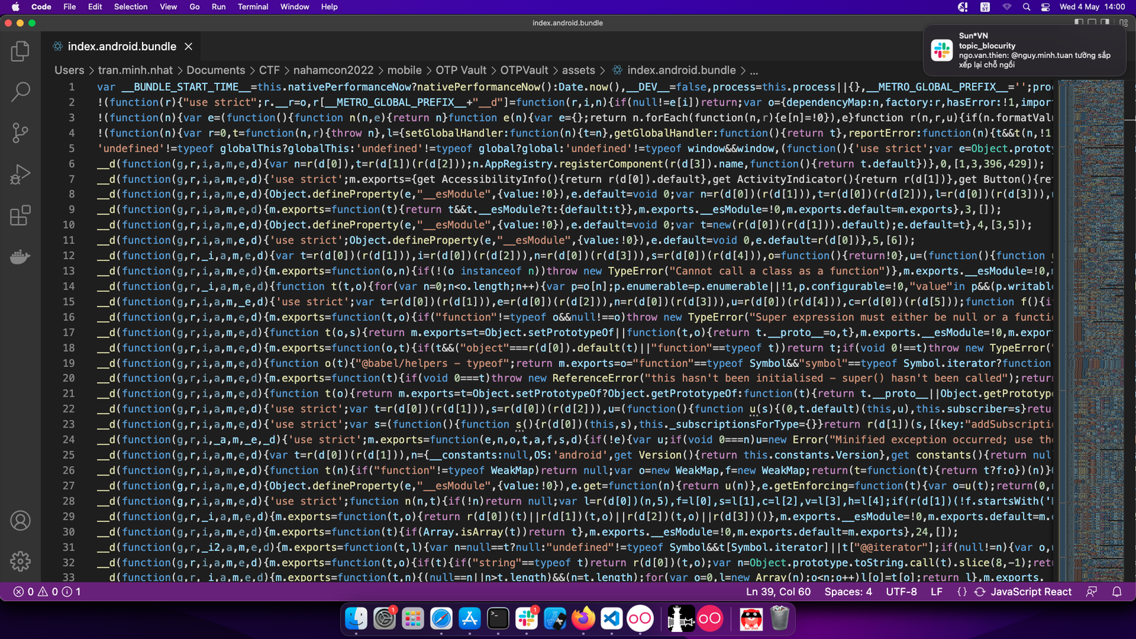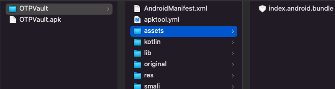Trong thư mục decompile được, chúng ta phát hiện 1 tệp tin index.android.bundle trong thư mục assets. Như vậy đây là một ứng dụng code bằng React Native, và tệp tin index.android.bundle chứa mã nguồn Javascript của ứng dụng.