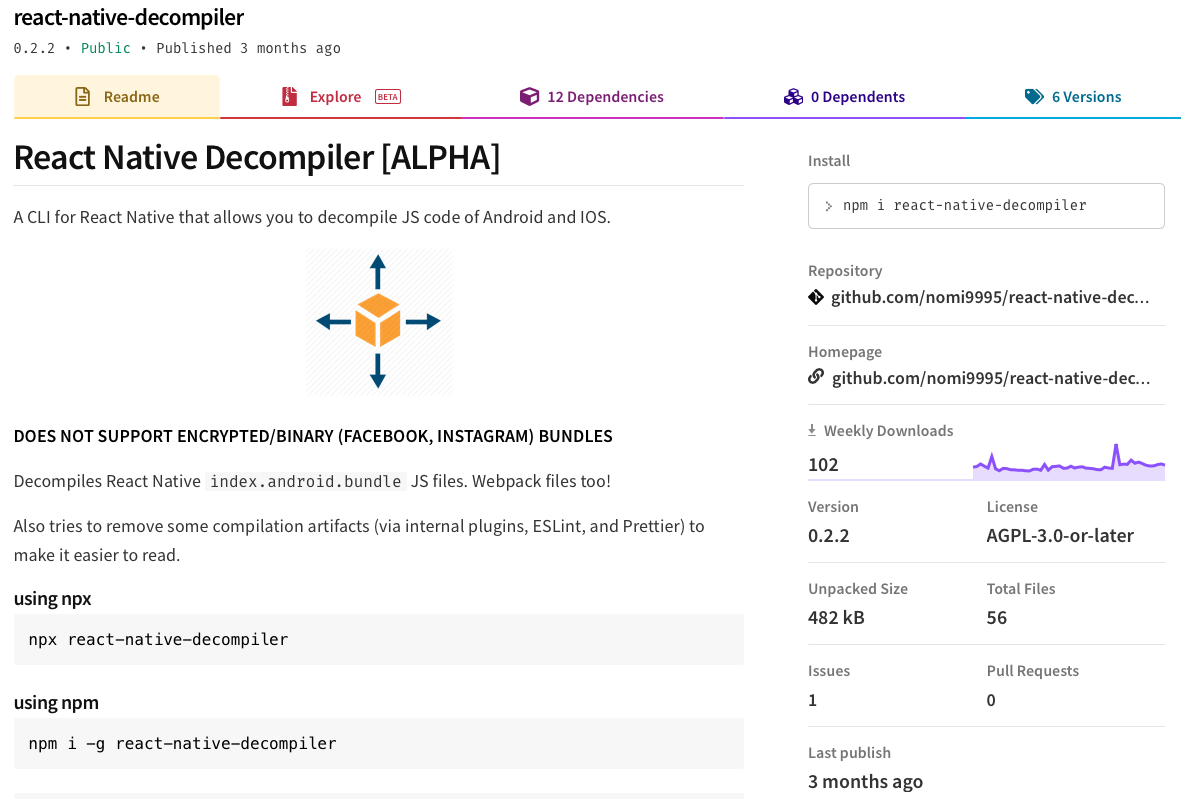 Vì vậy chúng ta cần tìm cách gỡ rối mã nguồn và chia nhỏ phạm vi tìm kiếm ra với công cụ react nativce decompiler. Công cụ này có thể được cài đặt qua NPM. Thông tin thêm về công cụ này có thể tìm được tại đây.