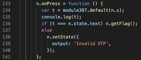 Đây là phần mã nguồn sẽ thực thi khi chúng ta nhấn vào nút "Submit": một câu điều kiện if sẽ được thực hiện, và nếu kết quả của điều kiện so sánh là True thì ứng dụng sẽ thực hiện HTTP request để lấy flag, còn nếu kết quả là False thì sẽ hiển thị "Invalid OTP".