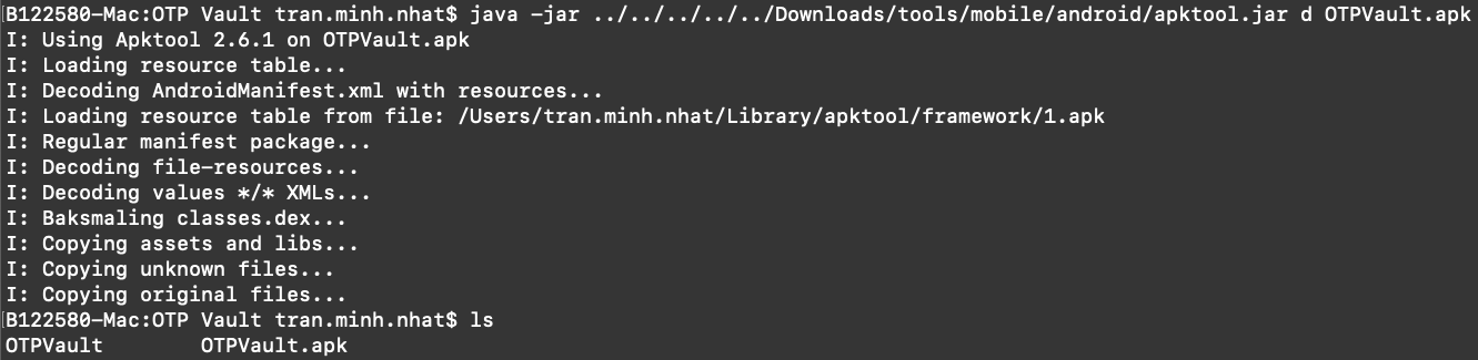 Sử dụng công cụ apktool để decompile tệp tin apk với câu lệnh quen thuộd: java -jar apktool.jar -d OTPVault