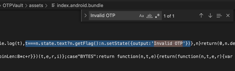 Chỉ với một thao tác đơn giản là bấm tổ hợp phím Ctrl + F và nhập vào từ khoá "Invalid OTP", chúng ta đã tìm được phần mã nguồn cần sửa đổi.