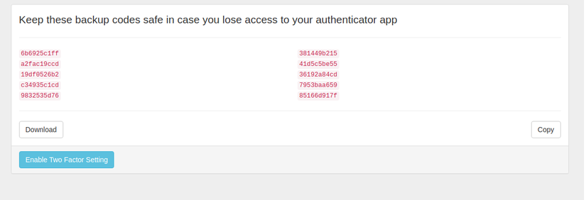 Sau khi thực hiên scan và verify otp, thì chúng ta sẽ chuyển qua trang backup codes này. Để thuận tiện cho hiển thị và sử dụng chức năng download, thì chúng ta nên lưu mã backup code này vào session để còn sử dụng lại. Nguyên nhân, vì mã backup code nếu đã được lưu vào database rồi, thì nó sẽ tiến hành mã hóa luôn, và không thể giải mã được. Nên cần lưu vào session để tiện sử dụng ở những chỗ khác. Khi enable chức năng two factor thành công thì chúng ta sẽ xóa session này đi