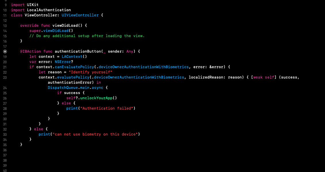- Class LAContext() giúp ta thực hiện các chức năng liên quan đến xác thực sinh trăc học như touchid hay faceID.