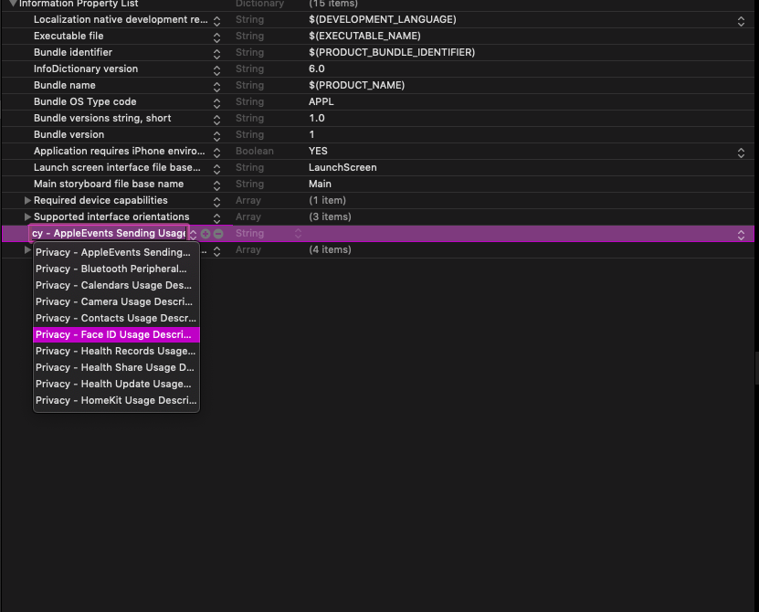 Ta cấp quyền sử dụng FaceID cho ứng dụng trong file info.plist :