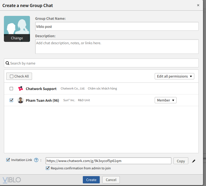 Sau đó mình tạo ra box chat và add nick real của mình vào.