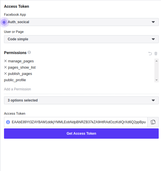 phần User or page bạn chọn fanpage bạn đang quản lý và muốn đăng. Ở phần permission bạn cần tối thiểu 2 quyền là : manage_pages và publish_page nhé. Sau đó submit và copy lại Access Token