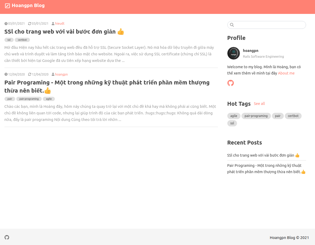 Sau vài hồi config các thứ, run localhost:8080 và mình đã có được cái blog như hiện tại trên kia kìa