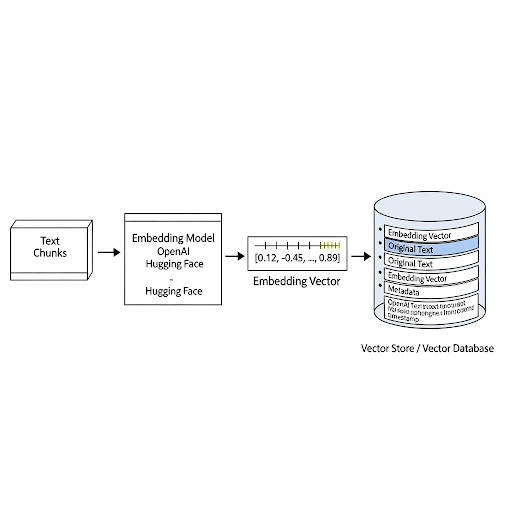- Quy trình thực hiện: Lặp qua từng chunk dữ liệu -> Dùng embedding model để tạo vector -> Lưu trữ cặp (vector, original_text, metadata) vào Vector Store.