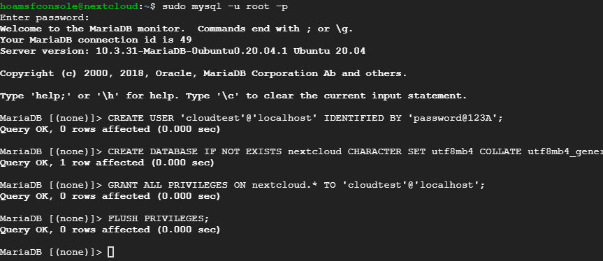 GRANT ALL PRIVILEGES ON nextcloud.* TO 'cloudtest'@'localhost';