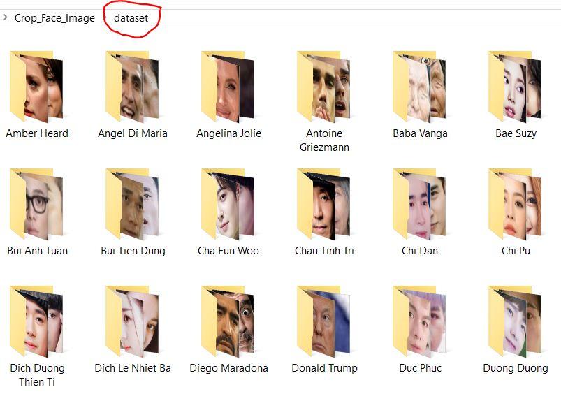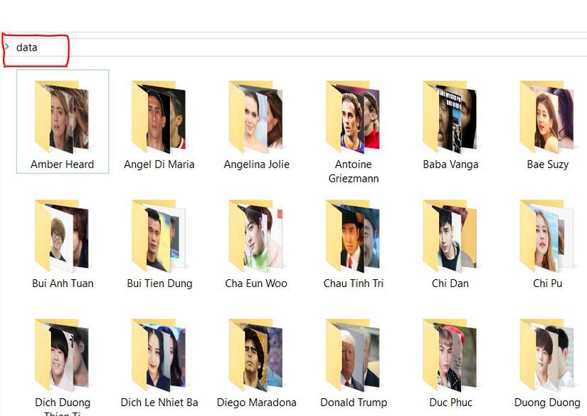 ![]() Thư mục "data" chứa các thư mục nhỏ chứa ảnh, tên từng thư mục được ghi tên của người nổi tiếng. Thư mục "data" chứa các thư mục nhỏ chứa ảnh, tên từng thư mục được ghi tên của người nổi tiếng.