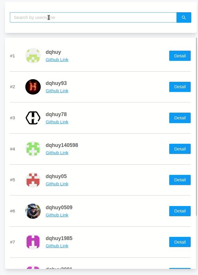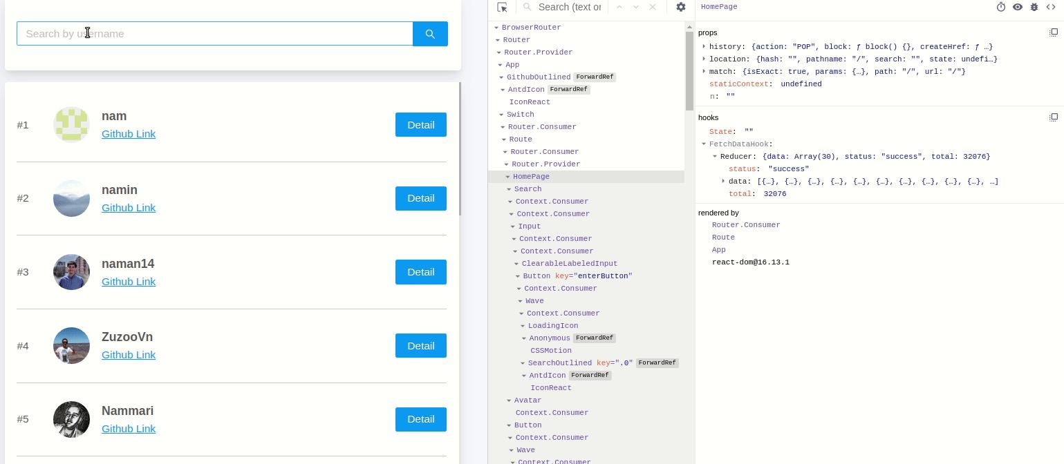 Ở bài trước ta đã có thể nhập nội dung vào ô tìm kiếm sau đó bấm enter hoặc nút tìm kiếm thì sẽ lấy được danh sách người dùng tương ứng với từ khóa mà chúng ta nhập vào ở ô input. Sau khi lấy được kết quả này từ API của GitHub thì chúng ta đã tiến hành console.log nó ra, cụ thể phần code đó như sau: