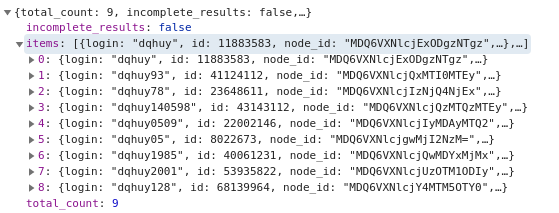 Ở đây key item trong kết quả mà chúng ta thu được chính là chưa danh sách người dùng tương ứng với từ khóa mà ta nhập: