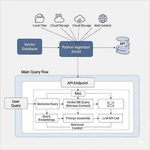 Data Ingestion Pipeline: script đọc dữ liệu từ PDF, doc, website → chunk → tạo embeddings (VD: text-embedding-3-small) → lưu vào Vector DB