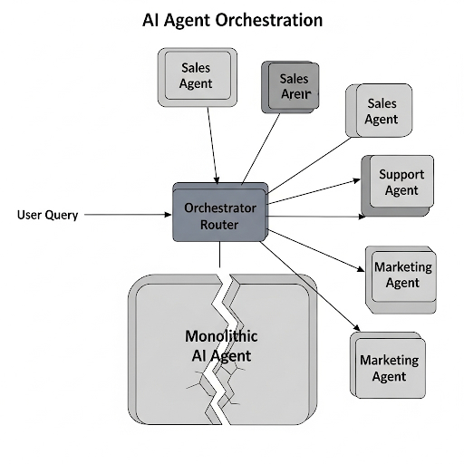 Trước tiên, cần thống nhất khái niệm: AI Agent Orchestration không phải là một framework, mà là một mẫu thiết kế hệ thống (system design pattern). Bạn có thể hình dung nó giống như kiến trúc Microservices: thay vì xây dựng một AI Agent "nguyên khối" (monolithic) cố gắng làm tất cả, chúng ta chia nhỏ thành nhiều Agent chuyên biệt. Ví dụ: