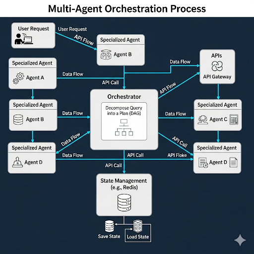 Orchestrator Agent: nhận yêu cầu → phân rã thành kế hoạch → giao task cho Agent chuyên môn