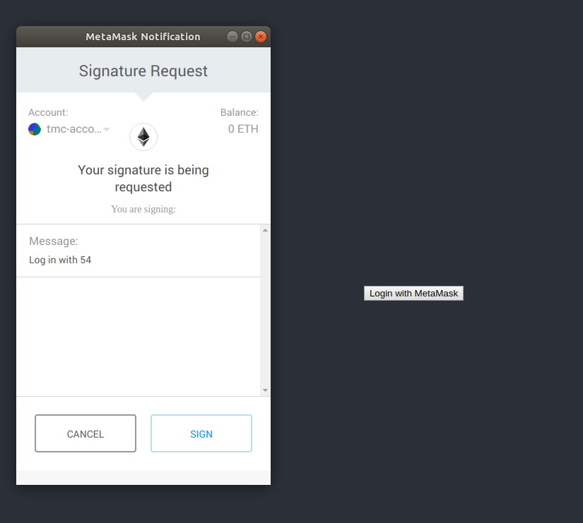 Từ nonce được lấy từ server ta sẽ có một message để kí có dạng : "Log in with " + nonce . Sử dụng metamask để kí message ta sẽ có một signature