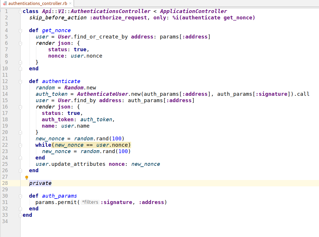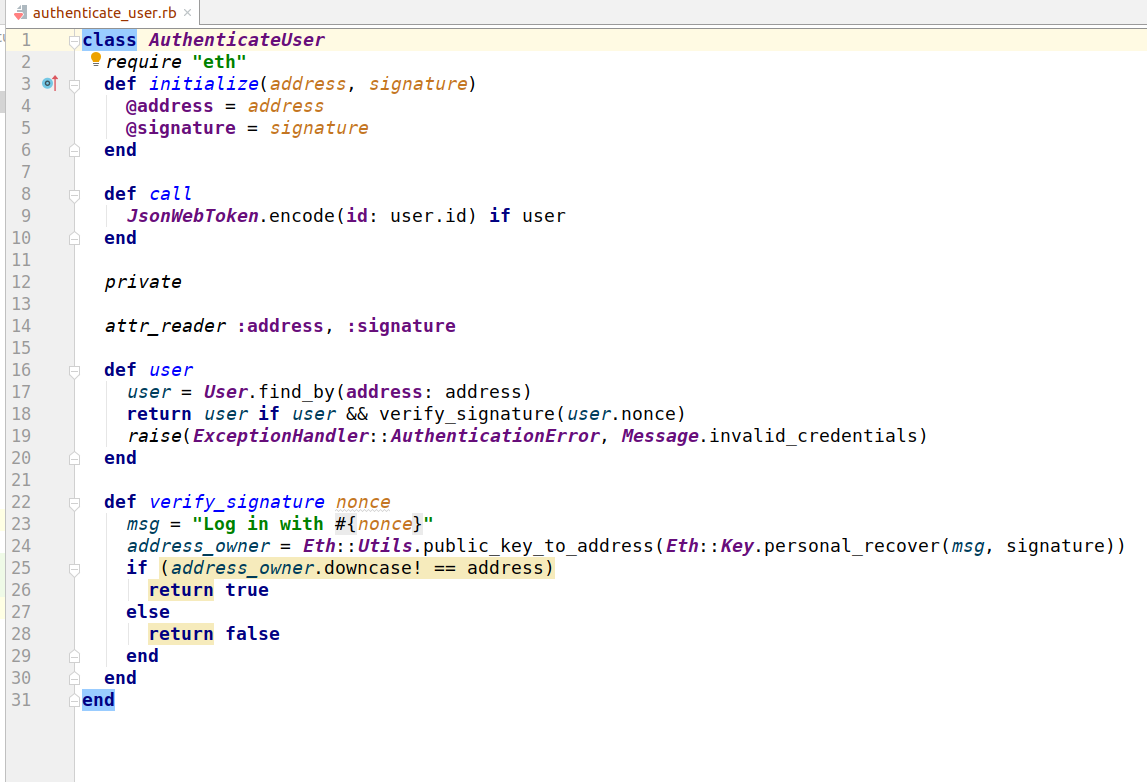 Trong này mình sẽ dùng hàm recover lại public key nên sẽ cần thêm gem eth (Các bạn thêm vào gemfile và bundle lại) Các bạn sẽ thấy một msg có nội dung giống với nội dung được kí bởi client là msg = "Login in with #{nonce}" sau khi đó sẽ dụng signature được gửi từ client để verify lại nó: