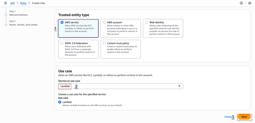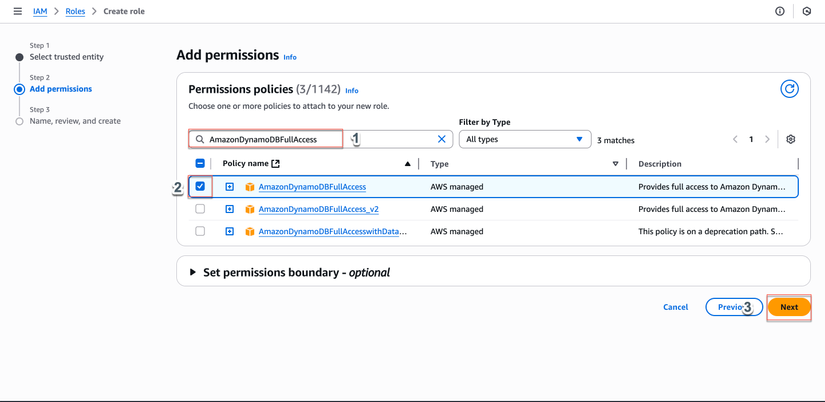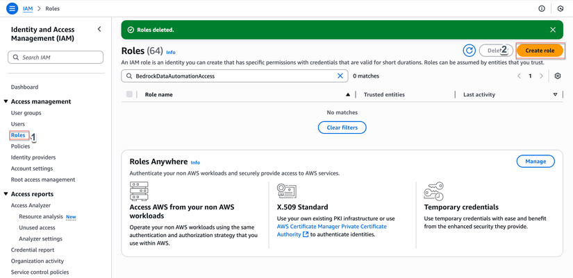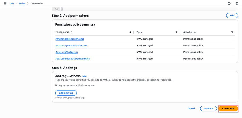 AWSLambdaBasicExecutionRole(để Lambda có thể write logs)AmazonS3FullAccess(để đọc/ghi S3)AmazonDynamoDBFullAccess(để lưu kết quả)AmazonBedrockFullAccess(để sử dụng Bedrock BDA)