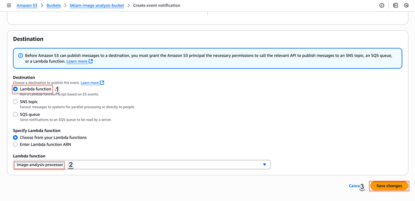 - AWS sẽ tự động thêm permission cho S3 invoke Lambda function