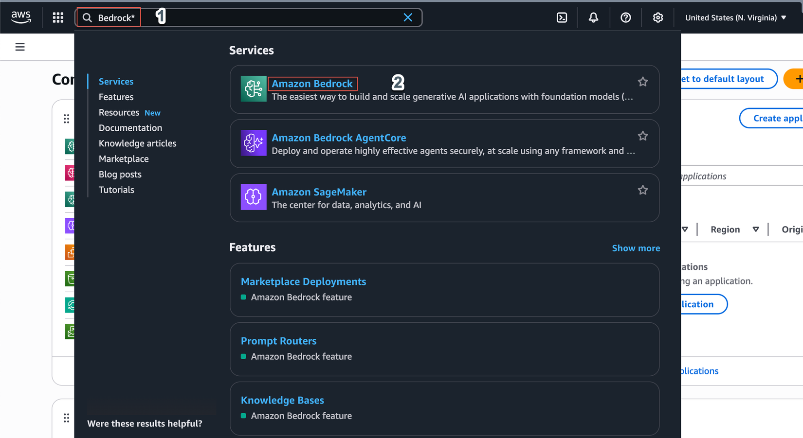 - Trong AWS Console, tìm kiếm và chọn Amazon Bedrock