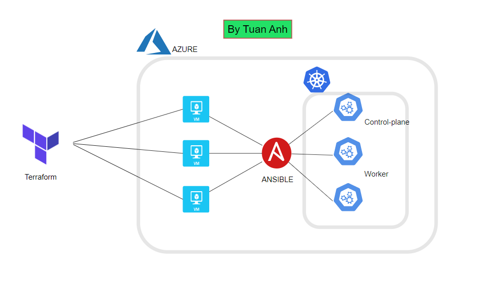 Mô hình 1: Sử dụng Terrafom để provision các VM trên MS Azure. Sau đó sử dụng Ansible để tạo hệ thống Cluster Kubernetes