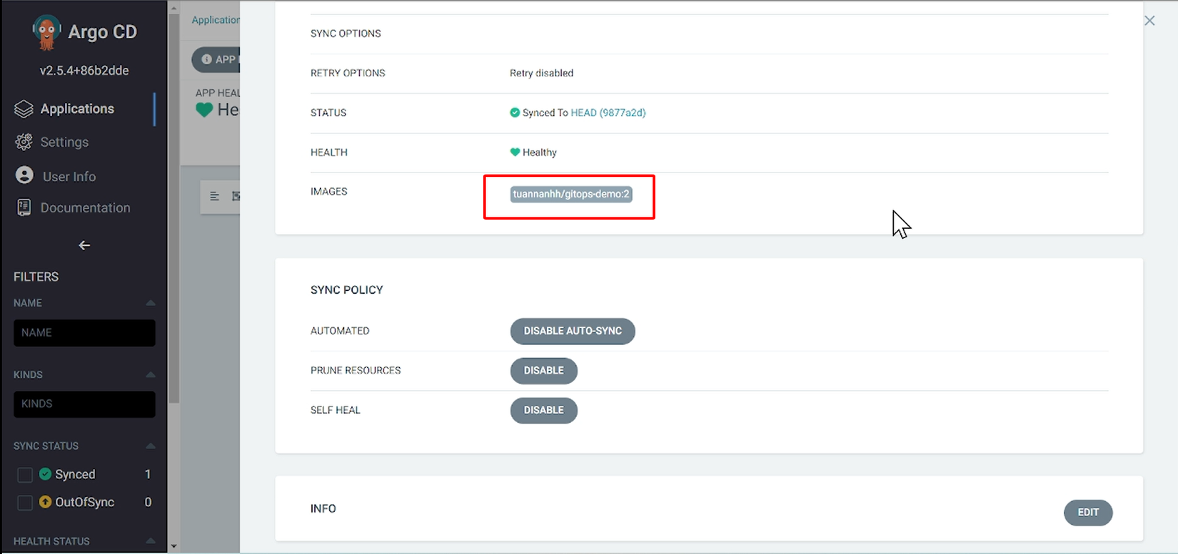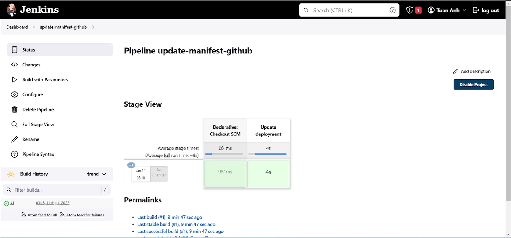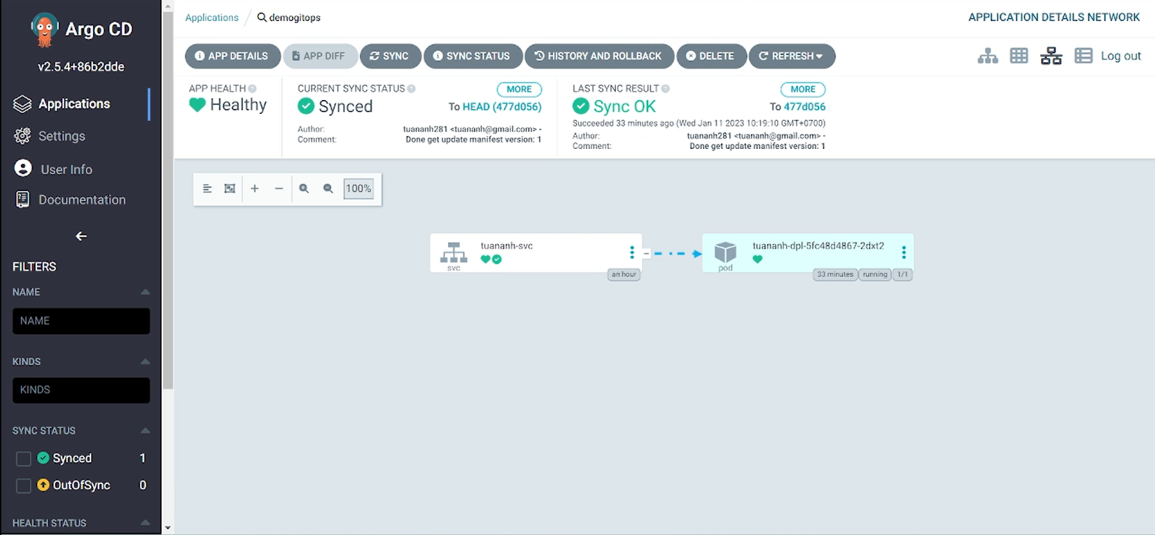 Sau khi setup khá loằng ngoằng , giờ đến lúc chúng ta nghiệm thu kết quả. Mọi người có thể chọn Build Now trong Job 1 trên Jenkins, hoặc thay đổi một vài thứ gì đó trong code và push lên repo github, khi đó Jenkins sẽ trigger thay đổi của github và sẽ tự động run Job 1. Trong Job1, khi đã build và push image lên dockerhub, bước cuối cùng job1 sẽ build Job 2. Cơ chế mấu chốt ở đây là biến dockertag, nó như là version của image, số version đó sẽ là lần thứ bao nhiêu Job đó chạy, và mỗi lần chạy sẽ là 1 version mới. Job 2 sẽ chạy sau khi nhận được paramester của Job 1 là dockertag, chạy sript để update version mới của image vào trong file deployment.yaml và sẽ push lại lên github repo. Trên ArgoCD, sau một khoảng thời gian, nếu minh nhớ không nhầm khoảng 180s thì Argo sẽ auto sync vs github và deploy file deployment.yaml