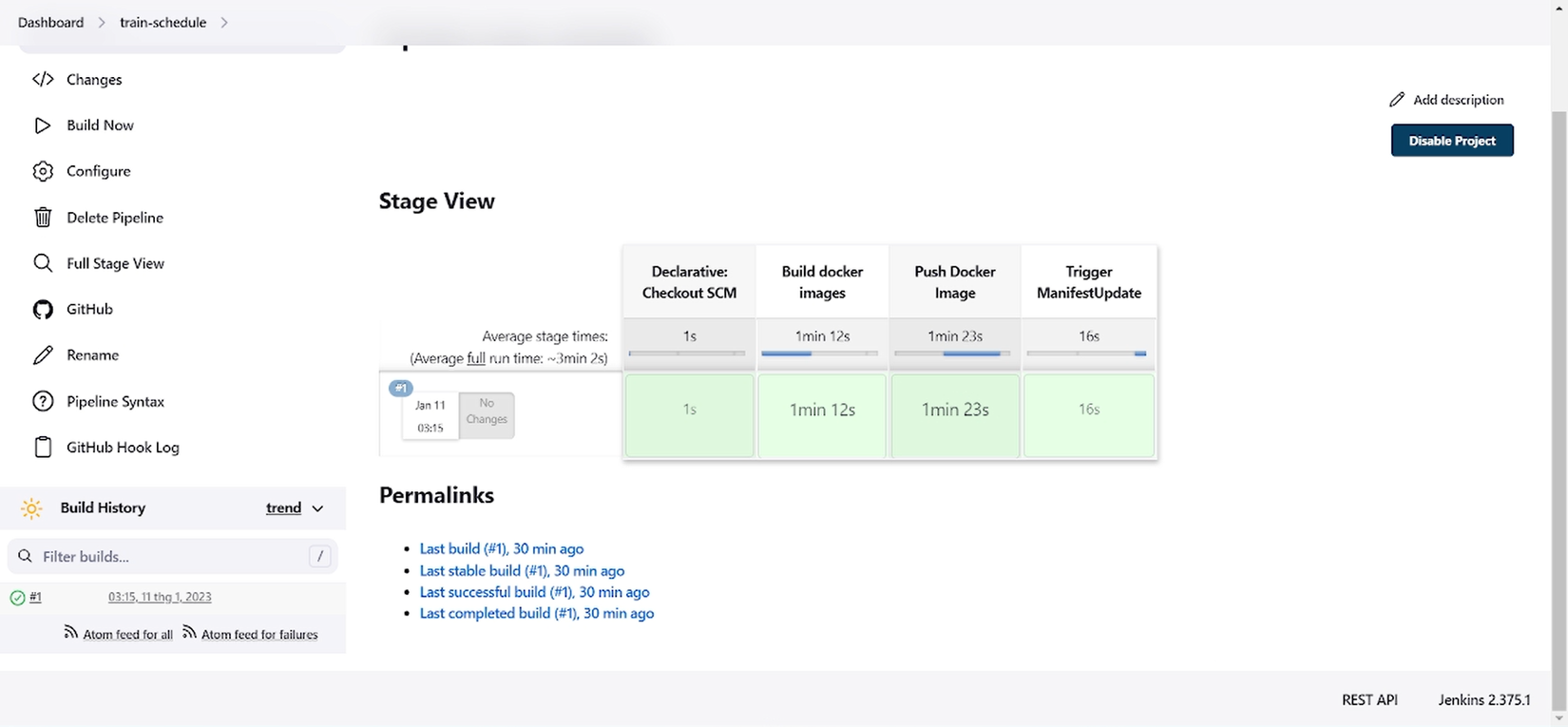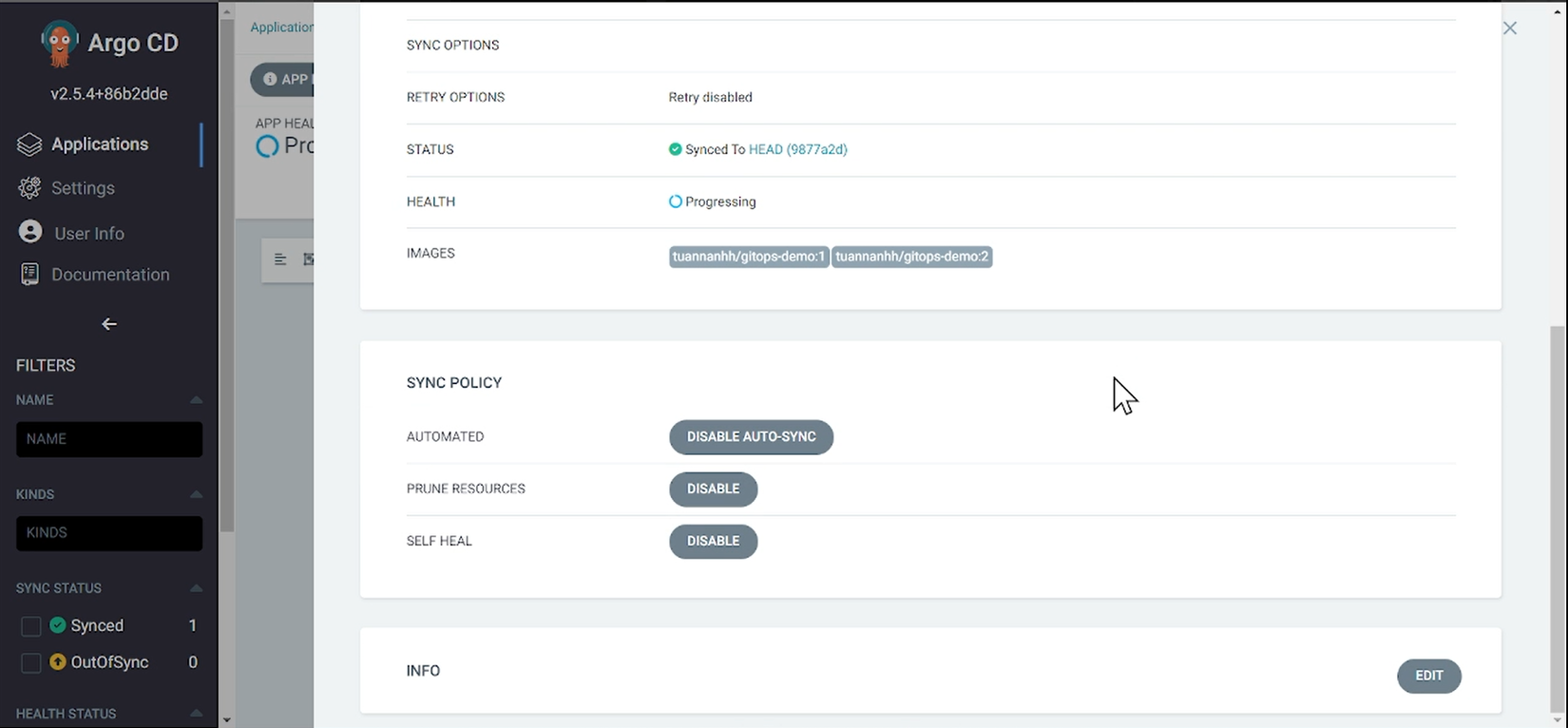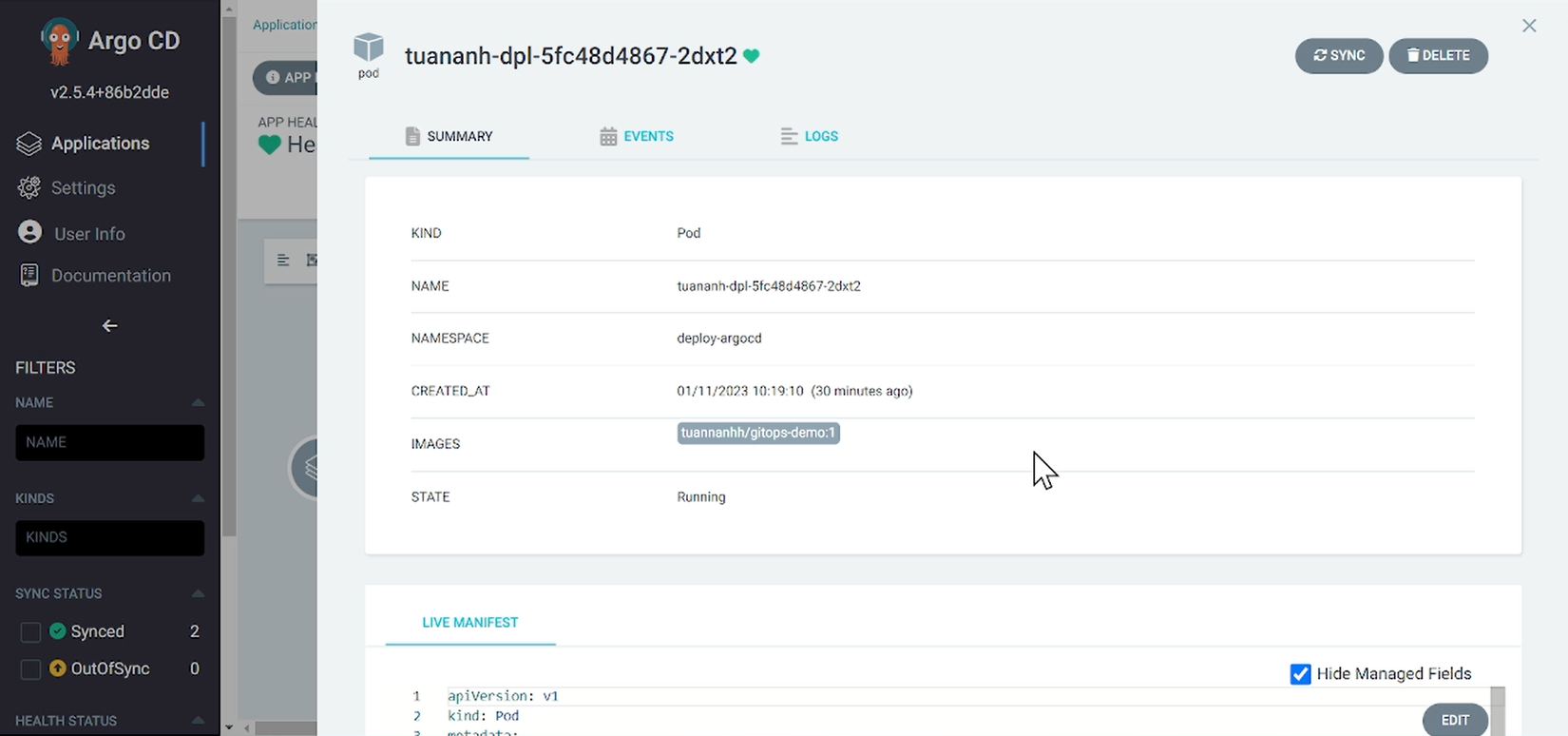 Sau khi setup khá loằng ngoằng , giờ đến lúc chúng ta nghiệm thu kết quả. Mọi người có thể chọn Build Now trong Job 1 trên Jenkins, hoặc thay đổi một vài thứ gì đó trong code và push lên repo github, khi đó Jenkins sẽ trigger thay đổi của github và sẽ tự động run Job 1. Trong Job1, khi đã build và push image lên dockerhub, bước cuối cùng job1 sẽ build Job 2. Cơ chế mấu chốt ở đây là biến dockertag, nó như là version của image, số version đó sẽ là lần thứ bao nhiêu Job đó chạy, và mỗi lần chạy sẽ là 1 version mới. Job 2 sẽ chạy sau khi nhận được paramester của Job 1 là dockertag, chạy sript để update version mới của image vào trong file deployment.yaml và sẽ push lại lên github repo. Trên ArgoCD, sau một khoảng thời gian, nếu minh nhớ không nhầm khoảng 180s thì Argo sẽ auto sync vs github và deploy file deployment.yaml