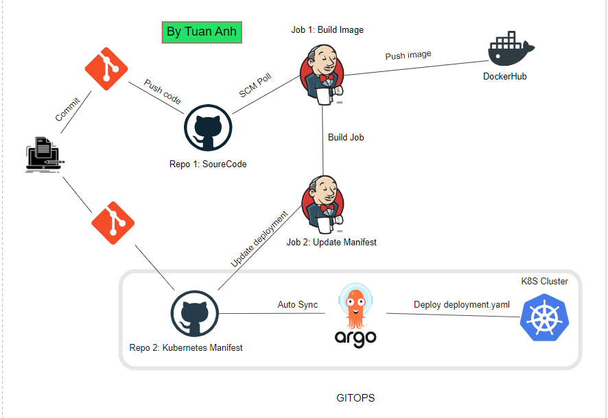 Dạo gần đây thì mình đọc qua nhiều JD thì thấy rất nhiều công ty đã, đang và chuẩn bị đưa hệ thống chay trên hệ thống Kubernetes, và mình thấy đa số họ sử dụng theo mô hình GitOps, mình thấy khá hay nên đã tìm hiểu và hôm nay mình viết bài này để chia sẻ về cách triển khai mô hình GitOps cơ bản nhất.