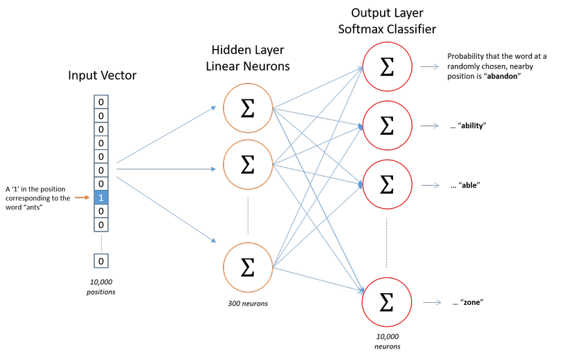 Cách thức: Cho một từ cụ thể ở giữa câu(input word), nhìn vào những từ ở gần và chọn ngẫu nhiên. Mạng neural sẽ cho chúng ta biết xác suất của mỗi từ trong từ vựng về việc trở thành từ gần đó mà chúng ta chọn.